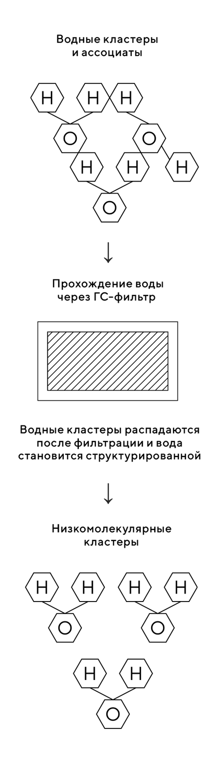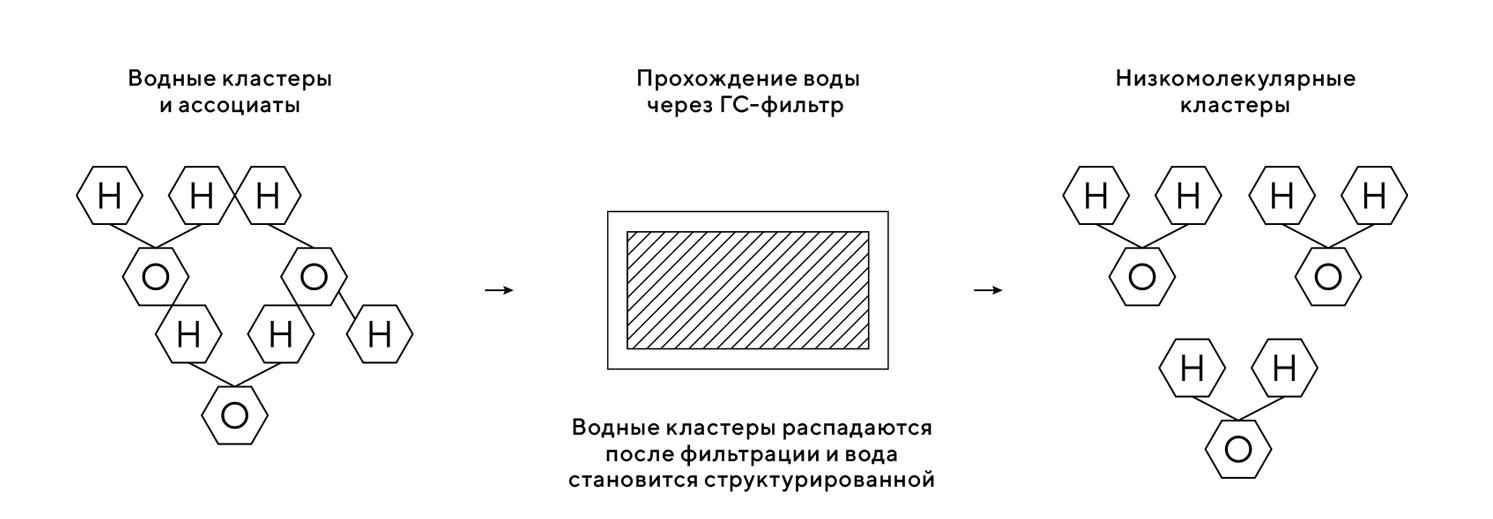 При уплотнении ГС в 2,5-3,5 раза образуется черная упругая масса, пронизанная множеством тонких извилистых каналов, имеющих диаметр порядка 100 нанометров. Сами частички ГС не являются наночастицами и в отфильтрованной воде углеродных наночастиц нет. Вода, проходящая через эти каналы, очищается от всех коллоидных примесей (включая бактерии и вирусы). При этом все истинные растворы (натуральные соли и микроэлементы) в воде остаются.